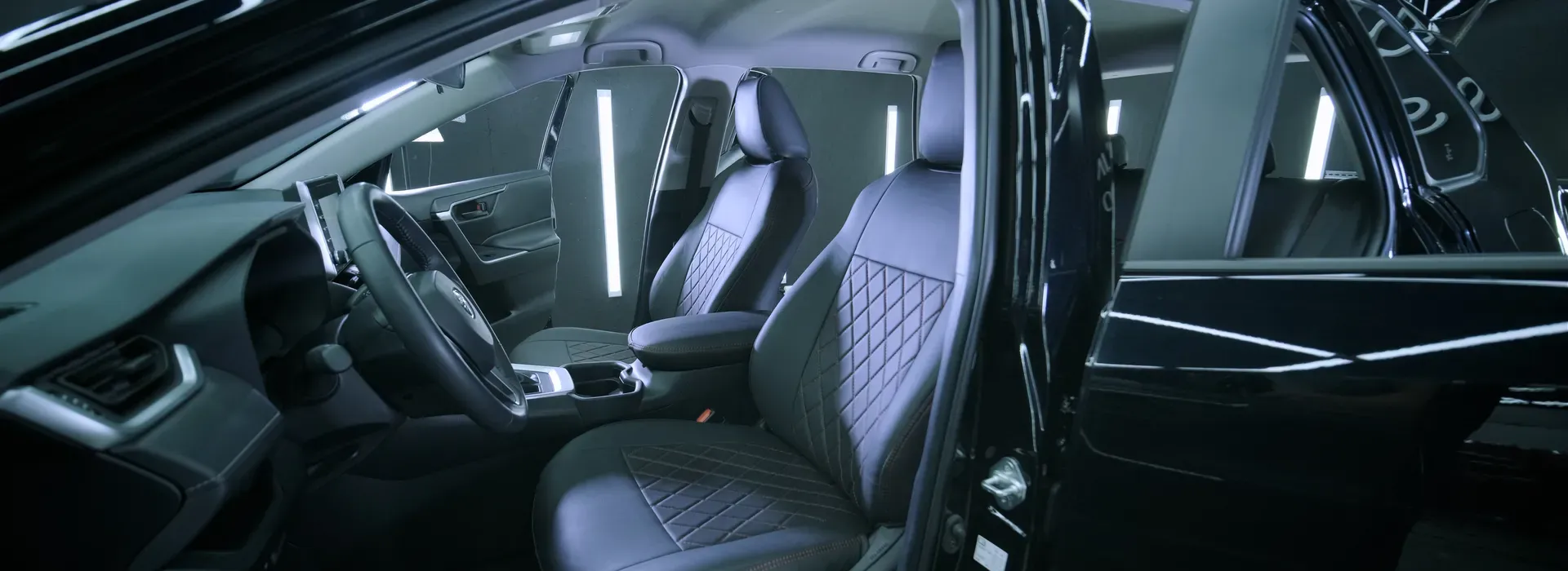 Чорна екошкіра може виглядати стандартно, а може — мати акуратну перфорацію, рівний шов і м’яку антару посередині — і тоді це уже не «чорний», а благородний спокійний тон, який робить салон сучасним і цілісним.