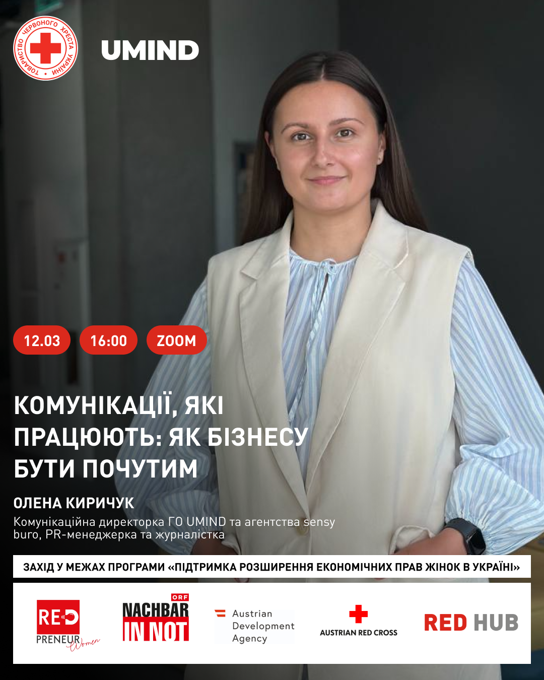 * Захід проводять у межах програми «Підтримка розширення економічних прав жінок в Україні», що реалізує Український Червоний Хрест у партнерстві з Австрійським Червоним Хрестом за підтримки NACHBAR IN NOT та Austrian Development Agency, за організаційної й технічної підтримки громадської організації UMIND.