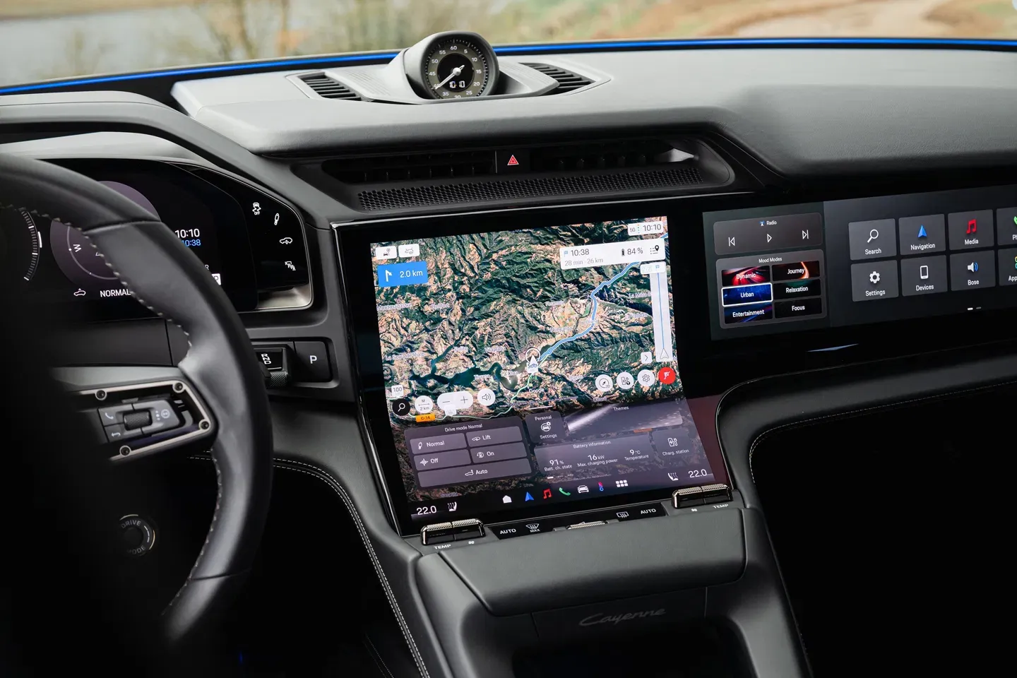 Салон у Porsche Cayenne 2026 Turbo Electric описано як простір, у якому екрани домінують візуально. Тут є 14,3-дюймова цифрова панель приладів, 14,9-дюймовий пасажирський дисплей, великий вигнутий кластер і нижня зона керування кліматом, музикою, телефоном та швидкими функціями. На папері це може насторожувати, бо ринок уже перенасичений автомобілями, у яких усе перенесли на сенсори й сховали в меню. Але цікаво, що вихідний текст описує інтерфейс набагато позитивніше, ніж можна було б очікувати. Система на базі Google OS названа інтуїтивною, а налаштовувані віджети й ярлики — справді зручними у використанні.